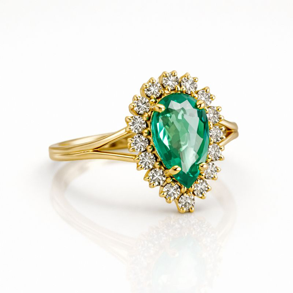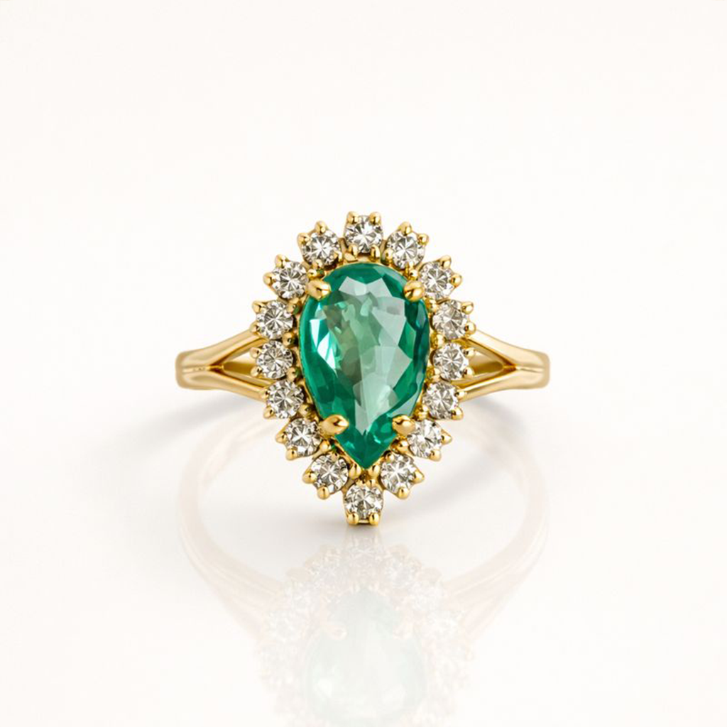Um anel de presença marcante, com leitura clássica e acabamento de alta joalheria. Ao centro, uma esmeralda em lapidação gota revela verde profundo e caráter natural, destacada por uma montagem que valoriza a altura e a proporção da gema. Ao redor, um halo radiante de diamantes lapidação brilhante cria um contorno luminoso e sofisticado, ampliando o brilho sem perder a elegância. Em ouro amarelo 18K, a estrutura foi pensada para manter conforto no uso e impacto visual real, com linhas limpas e cravação precisa.