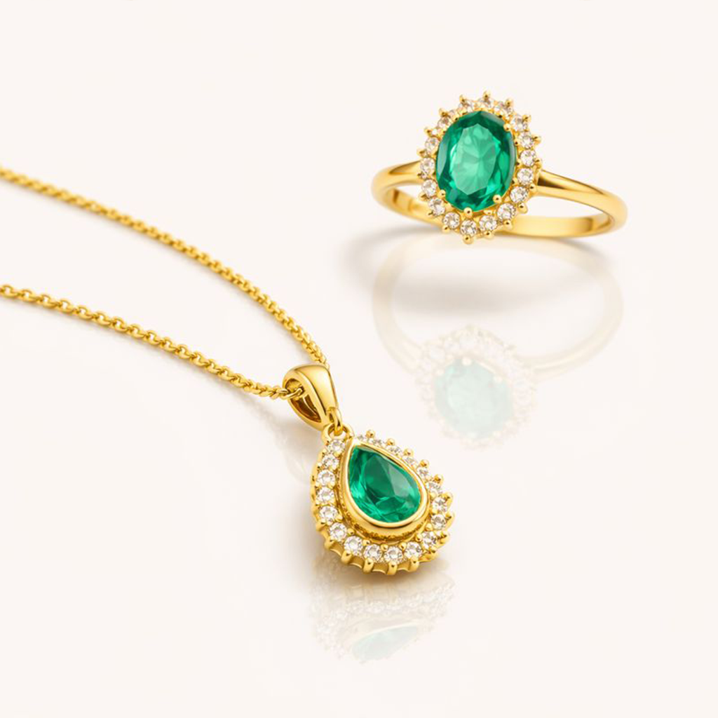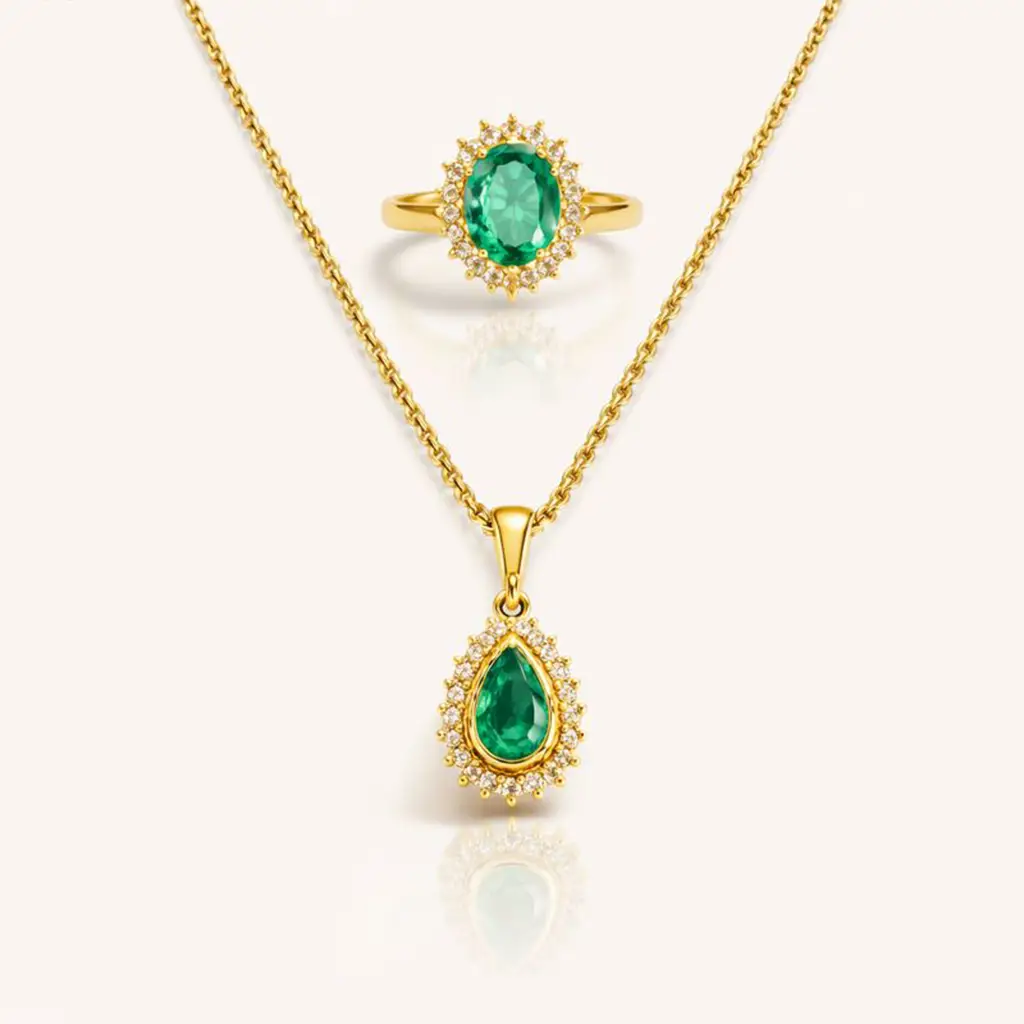Um conjunto de alta joalheria que equilibra delicadeza e presença com leitura clássica. O colar traz uma esmeralda em lapidação gota, de verde profundo e caráter natural, envolvida por um halo de diamantes lapidação brilhante que amplia a luz com refinamento. O anel acompanha a mesma linguagem estética, com esmeralda oval central cercada por diamantes, criando um conjunto coeso e luminoso. Em ouro amarelo 18K, as proporções foram pensadas para destacar as gemas e manter brilho controlado, com acabamento preciso e estética de permanência.